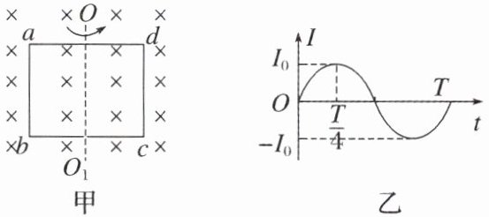 为了研究交流电的产生过程,小张同学设计了如下方案:将单匝矩形线圈放在匀强磁场中,线圈绕转轴OO₁按图示方向匀速转动(ab向纸外,cd向纸内),并从图甲所示位置开始计时,此时产生的交变电流如图乙所示。下列说法正确的是(