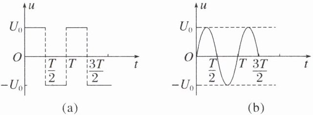 针对训练 (来自鲁科教材)阻值相等的甲、乙两电阻分别接到图(a)和(b)所示的方波交变电压、正弦式交变电压电路中,两种电压的周期和峰值都相等。求两电阻的电功率之比。