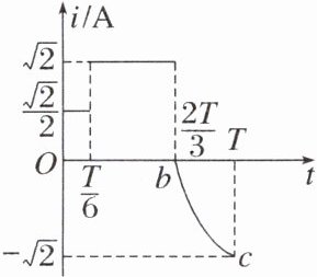 A [设该交变电流的有效值为I,则有$I^{2}RT = (\frac{\sqrt{2}}{2})^{2}R·\frac{T}{6} +(\sqrt{2})^{2}R·\frac{T}{2}+(\frac{\sqrt{2}}{\sqrt{2}})^{2}R·\frac{T}{3}$,解得$I=\frac{\sqrt{51}}{6}\ A$,故选A。]