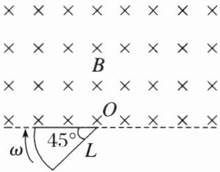 如图所示的区域内有垂直于纸面向里的匀强磁场,磁感应强度大小为 B。电阻为 R、半径为 L、圆心角为$45^{\circ}$的扇形闭合导线框绕垂直于纸面的 O 轴以角速度$\omega$匀速转动(O 轴位于磁场边界)。则导线框内产生的感应电流的有效值为( )