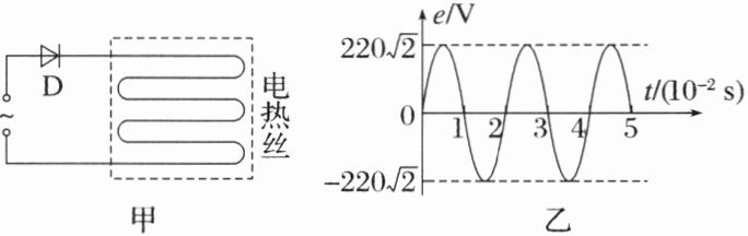 (多选)(2024·湖州市高二期末)如图甲所示是某种电热毯的电路图,电热毯接入如图乙所示的电源,电热毯由一理想二极管 D(正向电阻为零,反向电阻为无穷大)与电热丝串联组成。若电热丝的电阻为 110 Ω,下列说法正确的是(