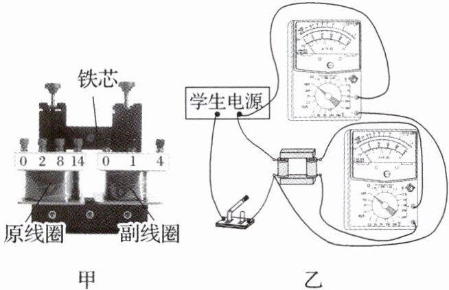 两只多用电表、学生电源(低压交流电源)、开关、可拆变压器(如图甲)、导线若干。