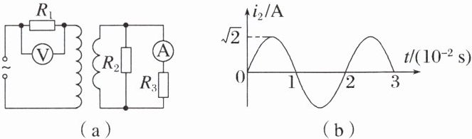 在如图(a)所示的交流电路中,电源电压的有效值为 220 V,理想变压器原、副线圈的匝数比为$10:1$,$R_{1}$、$R_{2}$、$R_{3}$均为固定电阻,$R_{2}=10\ \Omega$,$R_{3}=20\ \Omega$,各电表均为理想电表。已知电阻$R_{2}$中电流$i_{2}$随时间$t$变化的正弦曲线如图(b)所示。下列说法正确的是