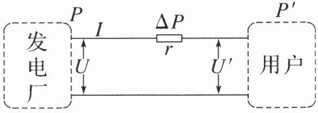 假设发电厂输出的电压为 $ U $,输送功率为 $ P $,输电线路中的电流是 $ I $,用户端的电压是 $ U' $,两条导线的总电阻是 $ r $。在图中,导线的电阻集中画为一个电阻 $ r $。