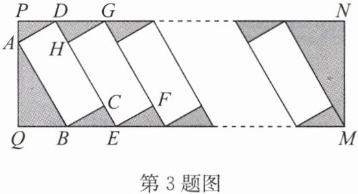 3. (2024·广东)中国新能源汽车为全球应对气候变化和绿色低碳转型作出了巨大贡献. 为满足新能源汽车的充电需求,某小区增设了充电站,如图是矩形 $PQMN$ 充电站的平面示意图,矩形 $ABCD$ 是其中一个停车位. 经测量,$\angle ABQ = 60°$,$AB = 5.4 m$,$CE = 1.6 m$,$GH \perp CD$,$GH$ 是另一个车位的宽,所有车位的长、宽相同,按图示并列划定.