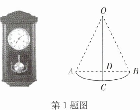 1. 如图,一架钟的钟摆 $OA$ 的长为 $15 cm$,当钟摆从最左侧摆到最右侧时,摆角 $\angle AOB = 52°$,$OC \perp AB$,垂足为 $D$,则 $CD$ 的长为(参考数据:$\sin 26° \approx 0.44$,$\cos 26° \approx 0.90$,$\tan 26° \approx 0.49$)(