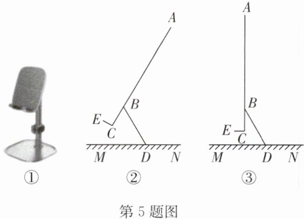 5. 图①为手机支架实物图,图②为它的侧面示意图,“L 型”托架 $A-C-E$ 用于放置手机,支架 $BD$ 两端分别与托架和底座 $MN$(其厚度忽略不计)相连,支架 $B$ 端可调节旋转角度,已知 $BD = 6 cm$,$AB = 2BD = 4BC$,支架调整到图②位置时,$\angle BDM = 60°$,$\angle ABD = 120°$. 因实际需要,现将支架 $B$ 端角度调整为 $\angle ABD = 150°$,如图③所示,则点 $A$ 的位置较原来的位置上升的高度为