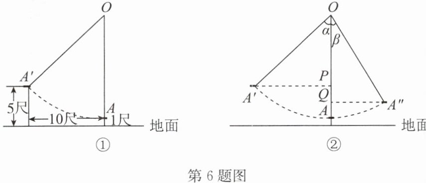 6. (2024·乐山改编)有一架秋千,当它静止时,踏板离地 $1$ 尺,将它往前推进 $10$ 尺(5 尺为一步),秋千的踏板就和某人一样高,这个人的身高为 $5$ 尺.(假设秋千的绳索拉的很直)