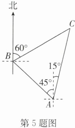 5.现在手机导航极大地方便了人们的出行,如图,小琪一家自驾到风景区$C$游玩,到达$A$地后,导航显示车辆应沿北偏西$45°$方向行驶 4 千米至$B$地,再沿北偏东$60°$方向行驶一段距离到达风景区$C$,小琪发现风景区$C$在$A$地的北偏东$15°$方向,那么$B,C$两地的距离为 (