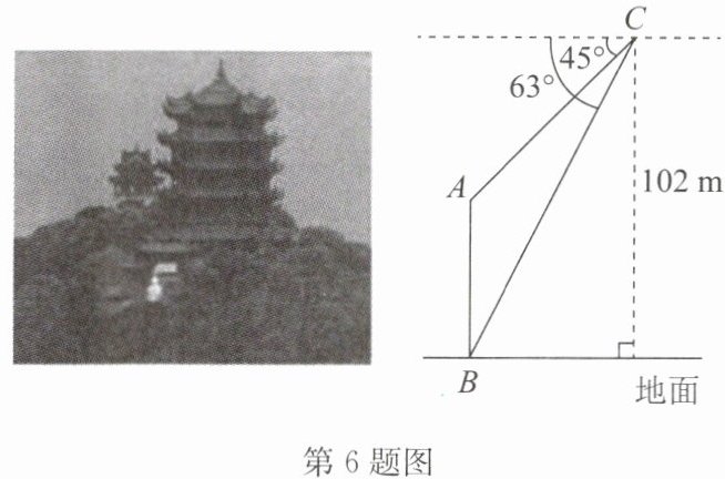 6.(2024·武汉)黄鹤楼是武汉市著名的旅游景点,享有“天下江山第一楼”的美誉.在一次综合实践活动中,某数学小组用无人机测量黄鹤楼$AB$的高度.具体过程如下:如图,将无人机垂直上升至距水平地面 102 m 的$C$处,测得黄鹤楼顶端$A$的俯角为$45°$,底端$B$的俯角为$63°$,则测得黄鹤楼的高度是