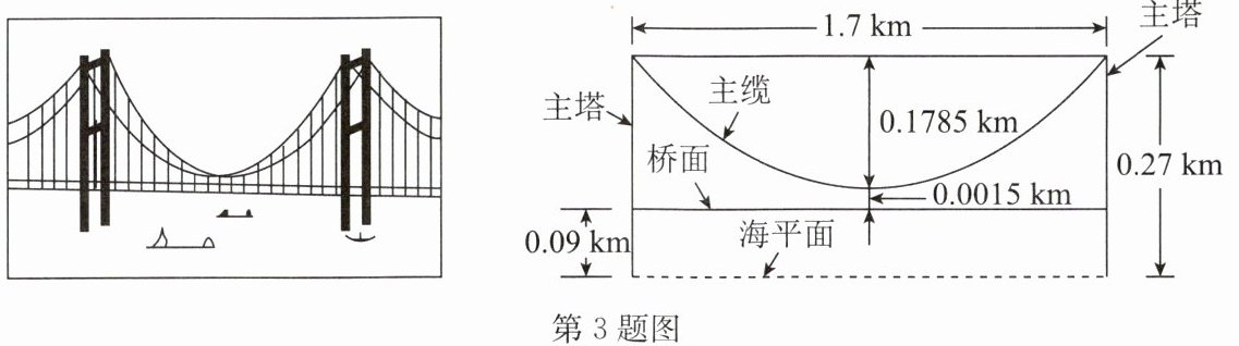 3. (2025·广东)如图,某跨海钢箱梁悬索桥的主跨长$1.7\ km$,主塔高$0.27\ km$,主缆可视为抛物线,主缆垂度$0.1785\ km$,主缆最低处距离桥面$0.0015\ km$,桥面距离海平面约$0.09\ km$.请在示意图中建立合适的平面直角坐标系,并求该抛物线的函数表达式.
