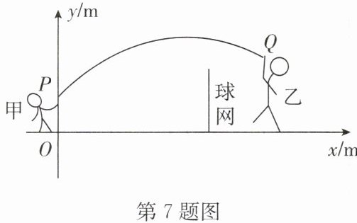7. 如图是甲、乙两人进行羽毛球比赛时的一个瞬间,羽毛球飞行的路线为抛物线的一部分.甲在点$O$正上方$1\ m$的$P$处发出一球,已知点$O$与球网的水平距离为$5\ m$,球网的高度为$1.55\ m$.当羽毛球在水平方向上运动$4\ m$时,达到最大高度$2\ m$.