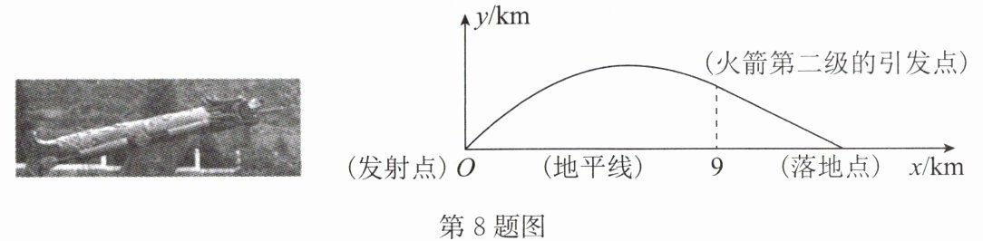 8. (2024·武汉)16世纪中叶,我国发明了一种新式火箭“火龙出水”,它是二级火箭的始祖.火箭第一级运行路径形如抛物线,当火箭运行一定水平距离时,自动引发火箭第二级,火箭第二级沿直线运行.某科技小组运用信息技术模拟火箭运行过程.如图,以发射点为原点,地平线为$x$轴,垂直于地面的直线为$y$轴,建立平面直角坐标系,分别得到抛物线$y = ax^{2} + x$和直线$y = -\frac{1}{2}x + b$.其中,当火箭运行的水平距离为$9\ km$时,自动引发火箭的第二级.