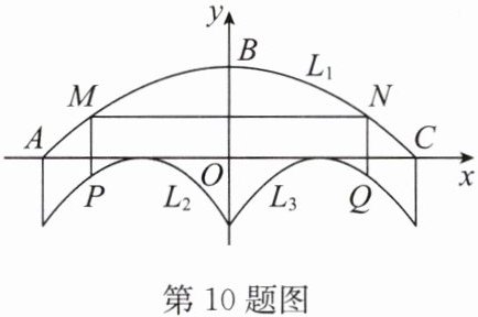 10.(14分)(2025·陕西)某景区大门上半部分的截面示意图如图所示,顶部$L_{1}$,左、右门洞$L_{2}$,$L_{3}$均呈抛物线型,水平横梁$AC=16 m$,$L_{1}$的最高点$B$到$AC$的距离$BO=4 m$,$L_{2}$,$L_{3}$关于$BO$所在直线对称.$MN$,$MP$,$NQ$为框架,点$M$,$N$在$L_{1}$上,点$P$,$Q$分别在$L_{2}$,$L_{3}$上,$MN// AC$,$MP\perp AC$,$NQ\perp AC$.以$O$为原点,以$AC$所在直线为$x$轴,以$BO$所在直线为$y$轴,建立平面直角坐标系.
