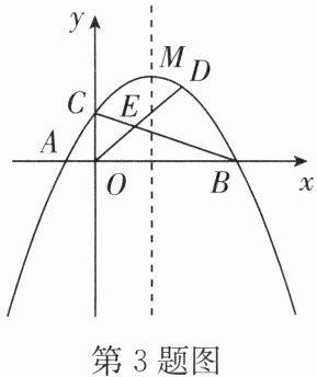 3. 如图,抛物线$y = - \frac{1}{2}x^{2} + \frac{3}{2}x + 2$与$x$轴交于点$A$,$B$,与$y$轴交于点$C$,顶点为$M$,连接 BC. 若$D$是直线 BC 上方抛物线上一动点,连接 OD 交 BC 于点$E$,当$\frac{DE}{OE}$的值最大时,求点 D 的坐标.