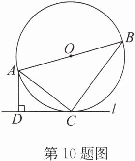 10. (2024·盐城)如图,点$C$在以$AB$为直径的$\odot O$上,过点$C$作$\odot O$的切线$l$,过点$A$作$AD \perp l$,垂足为$D$,连接$AC, BC$.