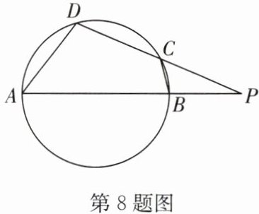 8. 如图,四边形$ABCD$是圆的内接四边形,$AB$,$DC$的延长线交于点$P$,若$C$是线段$PD$的中点,且$PD=6$,$PB=2$,那么$AB$的长为