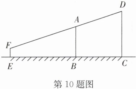 10. (2024·泗阳县期末)如图,一教学楼 $AB$ 的高为 20 m,教学楼后面水塔 $CD$ 的高为 30 m,已知 $BC = 30$ m,小张的目高 $EF$ 为 1.6 m. 当小张站在教学楼前 $E$ 处时,刚好看到教学楼顶端 $A$ 与水塔顶端 $D$ 在一条直线上,求此时他与教学楼的距离 $BE$.