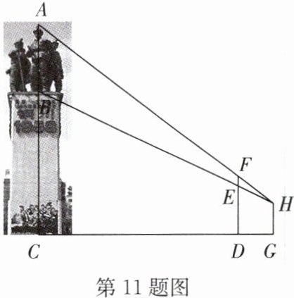 11. 某数学兴趣小组的同学计划测量雕塑上方人物铜像的高度 $AB$. 如图,小组同学在 $D$ 处竖立一根可伸缩的标杆,甲站在 $G$ 处恰好看到标杆顶端 $E$ 和人物铜像底端 $B$ 在一条直线上,$DG = 3$ 米,$CD = 33$ 米;甲站在 $G$ 处不动,小组同学调整标杆的高度,当标杆的顶点恰好在 $F$ 处时,甲看到标杆顶端 $F$ 和人物铜像顶端 $A$ 在一条直线上,$EF = 1$ 米,$AC \perp CG$,$FD \perp CG$,$HG \perp CG$,点 $B$ 在 $AC$ 上,点 $E$ 在 $DF$ 上,点 $C,D,G$ 在一条水平线上,请根据以上测量数据与方法求出人物铜像的高度 $AB$.
