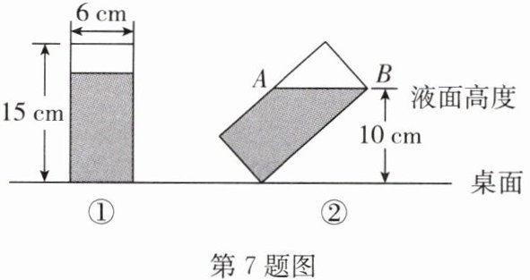 7. 如图①是装了液体的长方体容器的截面图(数据如图),将容器绕底面一条棱旋转倾斜后,水面恰好接触到容器口的边缘,如图②所示,此时水面宽度 $AB$ 为