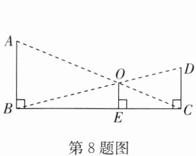 8. 据《墨经》记载,在两千多年前,我国学者墨子和他的学生做了“小孔成像”实验,阐释了光的直线传播原理.小孔成像的示意图如图所示,光线经过小孔 $O$,物体 $AB$ 在幕布上形成倒立的实像 $CD$(点 $A,B$ 的对应点分别是 $C,D$).若物体 $AB$ 的高为 6 cm,小孔 $O$ 到地面的距离 $OE$ 为 2 cm,则实像 $CD$ 的高度为