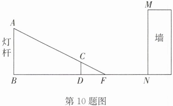 10. (2024·东台期末)如图,灯杆 $AB$ 与墙 $MN$ 的距离为 $18 m$,小丽在离灯杆(底部)$9 m$ 的 $D$ 处测得其影长 $DF$ 为 $3 m$,小丽身高为 $1.6 m$.