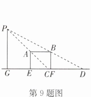 9. 如图,操场边的路灯 $P$ 照在水平放置的单杠 $AB$ 上,在地面上留下影子 $CD$,经测量得 $AB = 1.8$ 米,$CD = 3.24$ 米,单杠高 $1.6$ 米,则路灯 $P$ 的高度为
