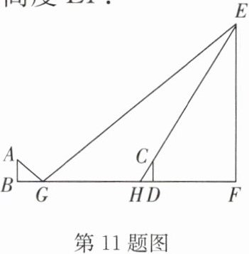 11. 某数学兴趣小组的同学想利用所学的知识测量一棵树的高度 $EF$. 如图,在第一次测量中,小莉来回走动,走到点 $D$ 时,其影子末端与树影子末端重合于点 $H$,测得 $DH = 1 m$. 随后,组员在直线 $DF$ 上平放一平面镜,在镜面上做了一个标记,这个标记在直线 $DF$ 上的对应位置为点 $G$. 镜子不动,小莉从点 $D$ 沿着直线 $DF$ 后退 $11 m$ 到点 $B$ 时,恰好在镜子中看到顶端 $E$ 的像与标记 $G$ 重合,此时 $BG = 2 m$. 已知 $AB \perp BF$,$CD \perp BF$,$EF \perp BF$,小莉的身高为 $1.6 m$(眼睛到头顶距离忽略不计,平面镜的厚度忽略不计). 根据以上信息,求树的高度 $EF$.