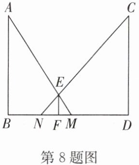 8. 如图,小明站在两路灯 $AB$,$CD$ 之间的点 $F$ 处,两路灯底部的距离 $BD = 10 m$,两路灯的高度均为 $8 m$,小明身高 $EF = 1.6 m$,他在路灯 $AB$ 下的影子 $FM = 1 m$,在路灯 $CD$ 下的影子为 $FN$,则 $FN =$