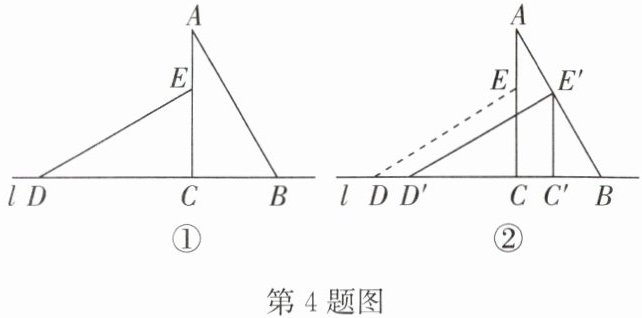 4. 将两块全等的含$30°$角的三角尺如图①摆放在一起,它们的较短直角边长为$6$,将$\triangle DCE$沿直线$l$向右平移到图②的位置,使点$E$落在$AB$上,则平移的距离$CC'$=