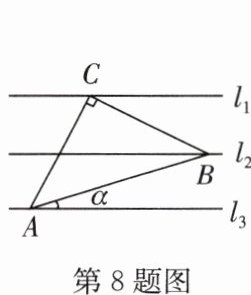 8. 如图,直线$l_1 // l_2 // l_3$,相邻两条平行直线间的距离相等. 若等腰直角三角形$ABC$的直角顶点$C$在直线$l_1$上,另外两个顶点$A$,$B$分别在直线$l_3$,$l_2$上,则$\sin\alpha$的值是