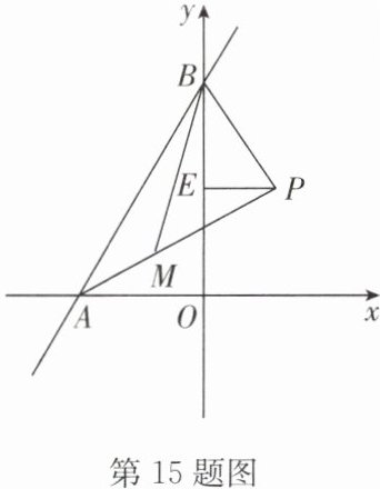 15. 如图,直线 $y = \sqrt{3} x + \sqrt{3}$与 $x$ 轴,$y$ 轴分别交于 $A$,$B$ 两点,$\angle OAB$ 的平分线与 $OB$ 的垂直平分线相交于点 $P$.