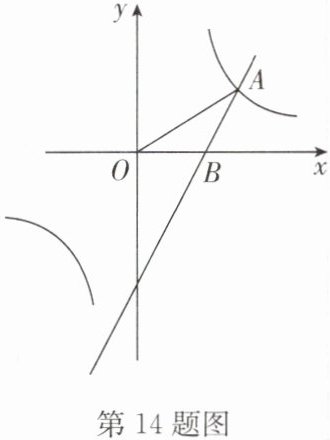 14. 如图,一次函数 $y = \sqrt{3} x + m$ 与反比例函数 $y = \frac{3\sqrt{3}}{x}$ 的图像在第一象限的交点为 $A(3, n)$.