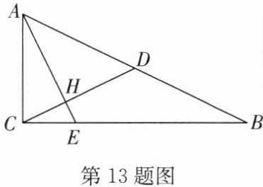 13. 如图,在$\bigtriangleup ABC$中,$\angle ACB = 90°$,$\angle CAB > \angle B$,$CD$是斜边$AB$上的中线,过点$A$作$\angle CAE = \angle B$,交$BC$于点$E$,交$CD$于点$H$,且$AH = 2CH$.