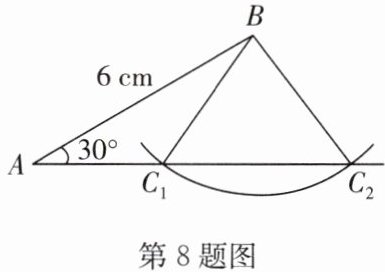 8. ($2024 ·$湖州一模)如图,小明想利用“$\angle A = 30°$,$AB = 6 cm$,$BC = 4 cm$”这些条件作$\triangle ABC$. 他先作出了$\angle A$和$AB$,在用圆规作$BC$时,发现点$C$出现$C_1$和$C_2$两个位置,那么$C_1C_2$的长是