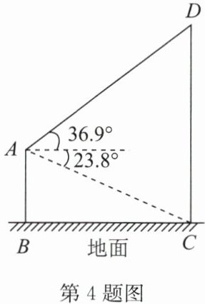 4. (2025·安徽)某公司为庆祝新产品上市,在甲楼与乙楼的楼顶之间悬挂彩带营造喜庆气氛.如图所示,甲楼和乙楼分别用与水平地面垂直的线段$AB$和$CD$表示,彩带用线段$AD$表示.工作人员在点$A$处测得点$C$的俯角为$23.8^{\circ}$,测得点$D$的仰角为$36.9^{\circ}$.已知$AB = 13.20\ m$,求$AD$的长(精确到$0.1\ m$).
