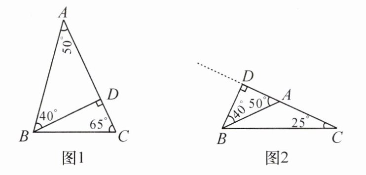1. 等腰三角形一腰上的高与另一腰的夹角为 $ 40^{\circ} $,则它的底角为 $ 65^{\circ} $。
