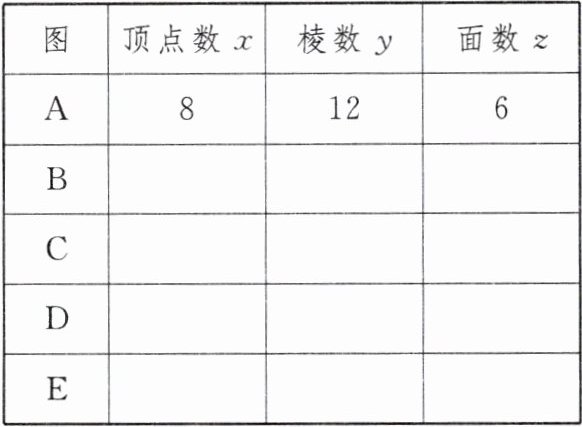 (1)请将图B,C,D,E中的木块的顶点数、棱数和面数分别填入下表: