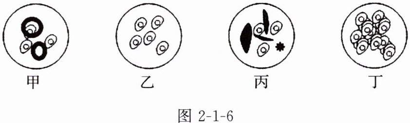 6. 在用低倍物镜观察人口腔上皮细胞实验中,甲、乙、丙、丁四位同学分别在视野中看到的物像如图2-1-6所示。四位同学中观察效果最好的是(