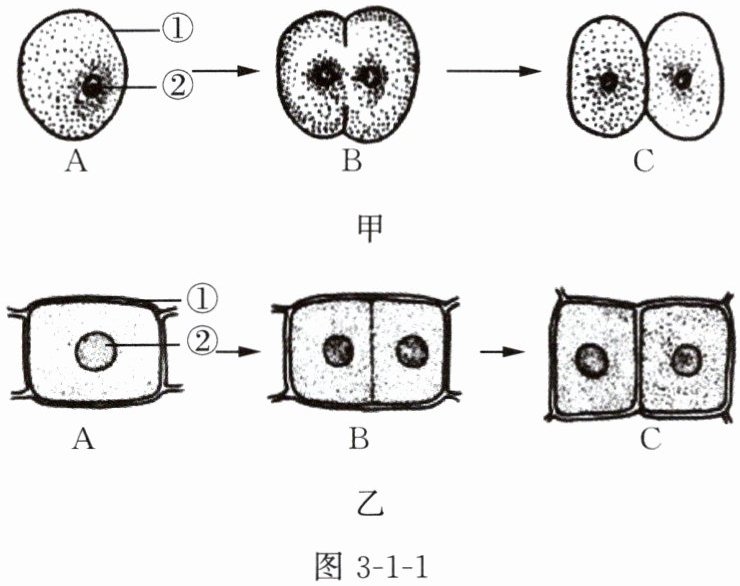 7. 图 3-1-1 中甲和乙表示两类生物细胞的分裂过程,请据图回答下列问题。