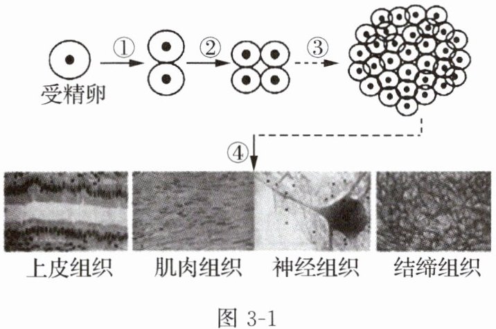 1. 你从一个受精卵发育成长为一名中学生,让我们感受到了生命的奇妙变化,图3-1为人体组织形成过程的示意图。请分析回答问题。