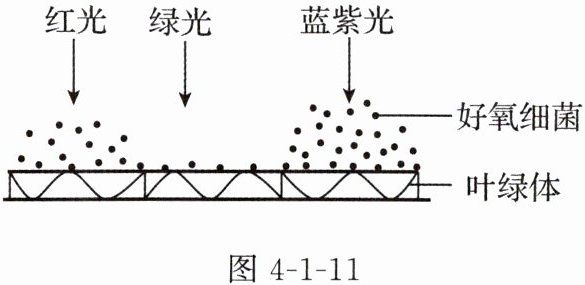 2. (科学思维)用新鲜水绵和好氧细菌(有氧才能生存)制成临时装片,用不同的光束照射水绵。一段时间后,在显微镜下观察到细菌由均匀分布变成如图4-1-11所示分布。该实验不能得出的结论是(