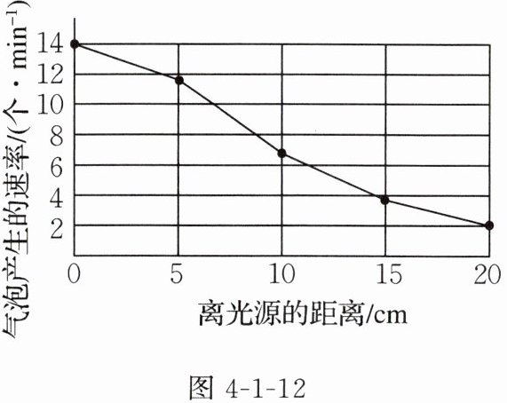 3. 某同学选用生长旺盛的金鱼藻进行实验,在量筒内加入250mL清水和一段新鲜的金鱼藻,然后将量筒置于离光源不同距离处,分别测量金鱼藻单位时间内释放的气泡数,测量结果如图4-1-12所示。该实验探究的变量及产生的气体分别是(