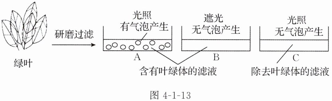 4. 科学家为探究光合作用的奥秘,采摘生长旺盛的树叶进行了如图4-1-13所示的实验,相关分析正确的是(