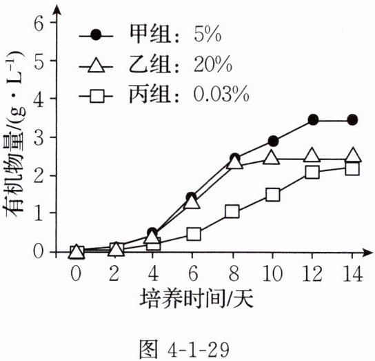 (2)课外小组同学测定不同$CO_2$浓度条件下小球藻培养液中的有机物量,结果如图4-1-29所示。