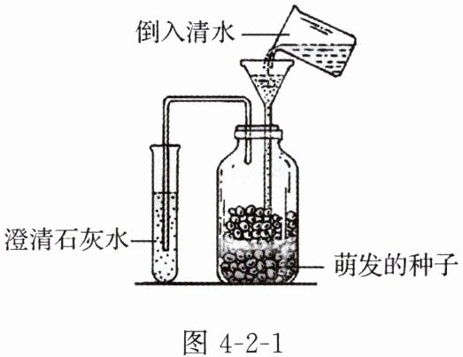 6. 某人利用已萌发的种子进行实验(如图 4-2-1 所示)。几小时后经漏斗倒入一杯清水,同时观察澄清石灰水的变化。下列关于此项实验的叙述,正确的是(