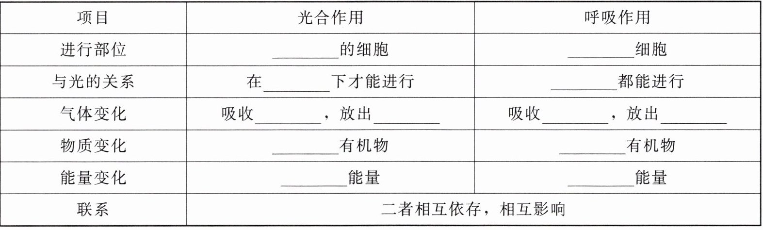 有叶绿体;所有活;光;有光无光;二氧化碳;氧气;氧气;二氧化碳;合成;分解;储存;释放