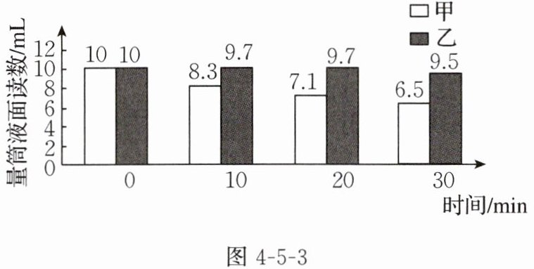 4. 取甲、乙两个相同的量筒,各放入一段长势相近的植物枝条,摘除乙量筒中枝条的叶,甲量筒中枝条不做处理。然后分别注入清水至10 mL处,并加入等量油滴覆盖液面。将两装置放在阳光下,每隔10 min记录量筒液面的读数,结果如图4-5-3所示。下列分析正确的是(