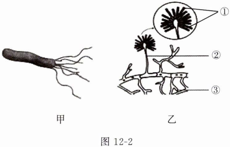 3. 图 12-2 中甲、乙分别为幽门螺杆菌模式图和黄曲霉结构示意图。幽门螺杆菌是常见的胃肠道致病细菌,会引起胃溃疡、萎缩性胃炎,甚至胃癌。黄曲霉是一种常见的腐生真菌,某些黄曲霉菌株产生的黄曲霉素是一种致癌物质。请据图回答下列问题。