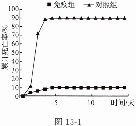 现对鳗鱼分组,一组接种疫苗为免疫组,另一组不做处理为对照组,实验结果如图 13-1 所示,根据相对免疫保护力的计算公式以及图中数据,可计算出鳗弧菌减毒疫苗的相对免疫保护力为